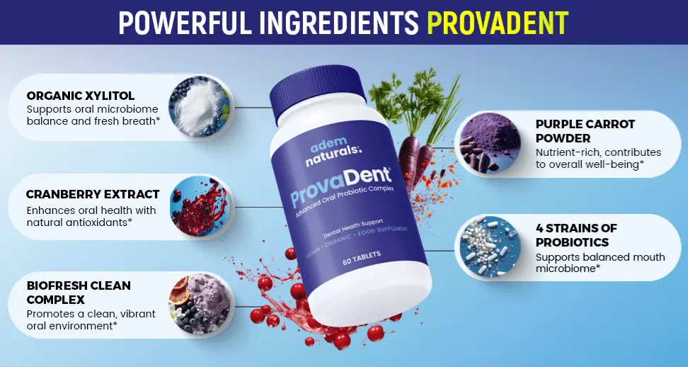 Note: While active components like probiotics and extracts are highlighted, the full list (including any binders or fillers) isn’t always detailed online. Check the packaging or reach out to support@getprovadent.com or 1-814-885-4823 for complete transparency.